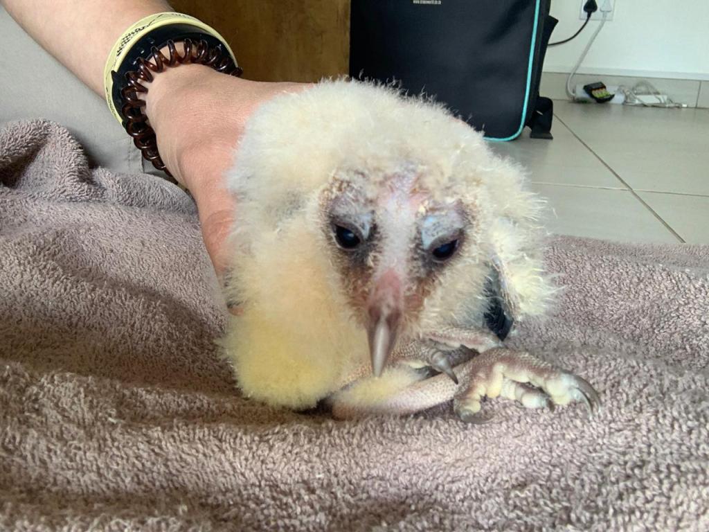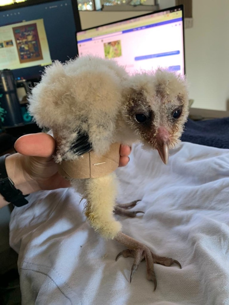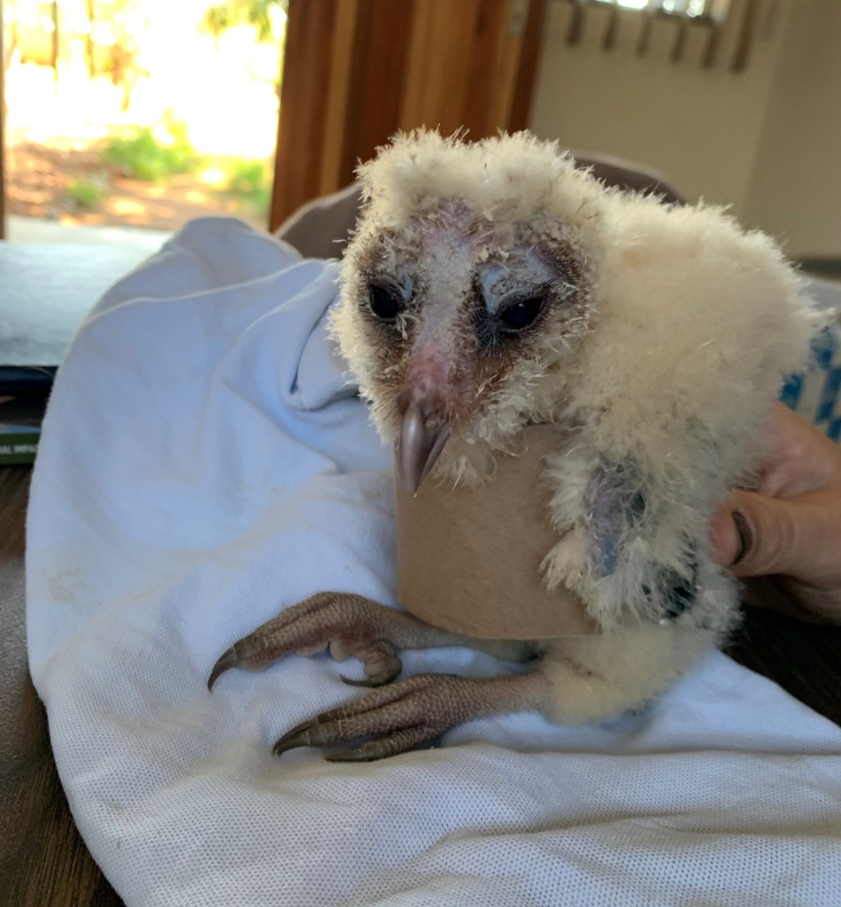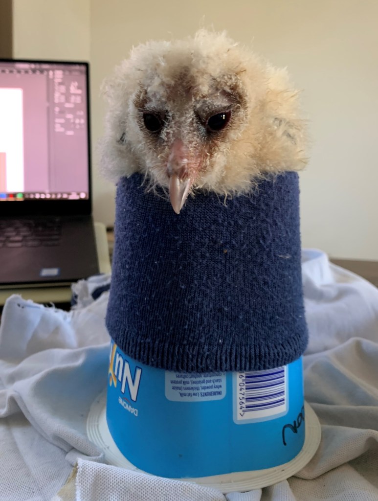 You can see here that her legs sort of crisscross over each other, which is not good. Also if you are not supporting her upright or if she is not nestled into her nest in a way that props her up, she flops over onto her side and flails her legs all around still. I have been chatting with some bird vets and raptor rehabbers all around the world and we are trying to devise a homemade splint for Hedwig so that her bones can all grow normally with her. And boy is she growing fast! She is now extra fluffy with little with down feathers to the point that I think even normal people might start calling her ‘cute’ – at least people won’t call her a vulture anymore!