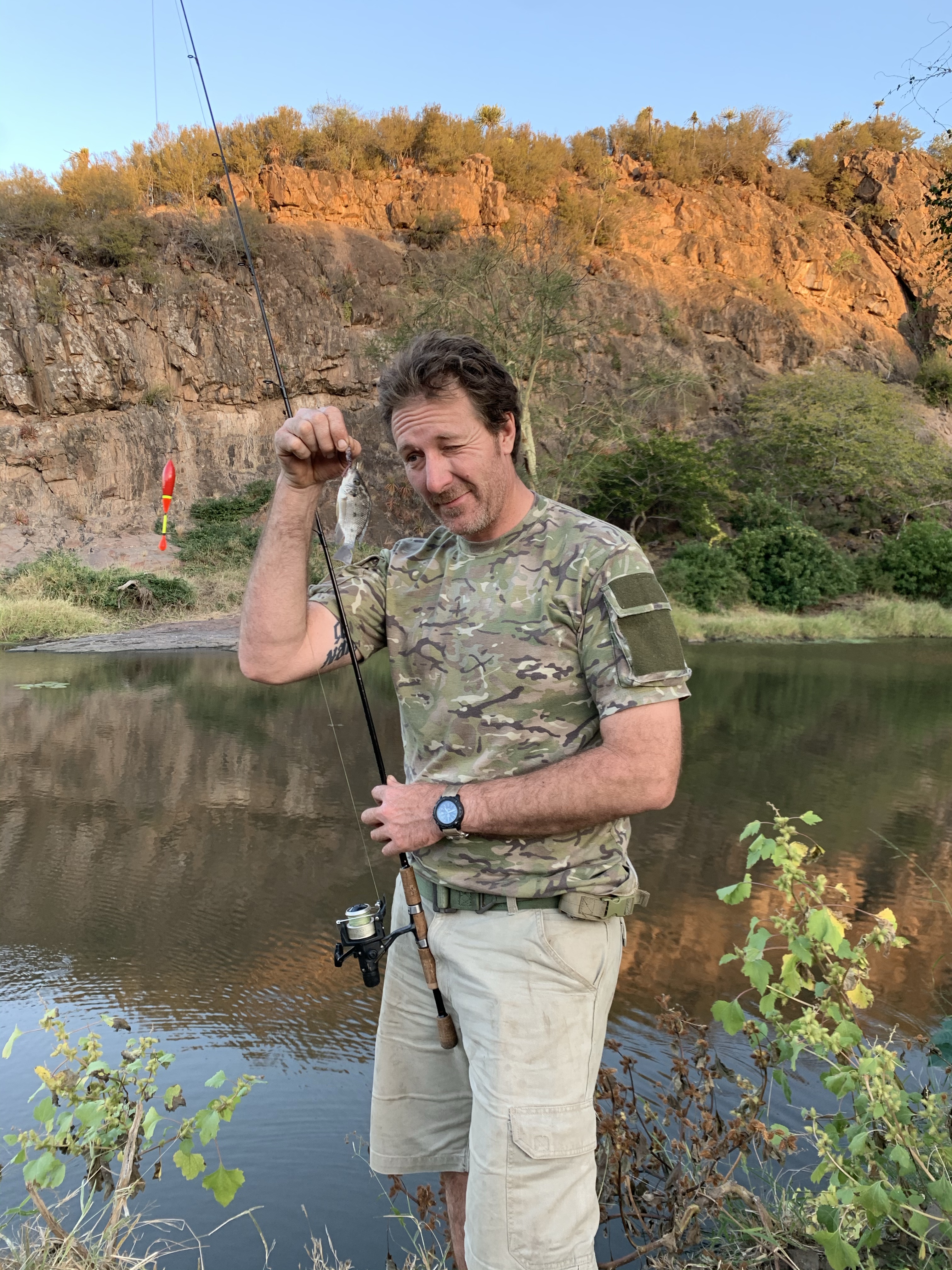 It was a lovely and much needed day out. Our spot was nestled next to the river and some stunning rock cliffs. There was a pod of hippos that kept popping there heads up throughout the day to keep a cautious eye on us. The weather was perfect throughout the day, the sun was warm, but not hot and there was a constant breeze. The fishing were biting like mad the kids were having such a jol catching them piercing the air with joyous screams of “FISH ON!” each time they had a bite on the line. We braai’d braaibroodjies and wors. Hmm…. I just realised I should probably make a South African slang translation post for you Americans reading along… stay tuned, I will get on that now! We packed up as it started getting dark to make our way back to Mbilu (the reserve headquarters where most of us live and where the offices are), which was about a 2-3 hour drive. I even spotted a cheeky hyena checking out the braai site as we were packing up.