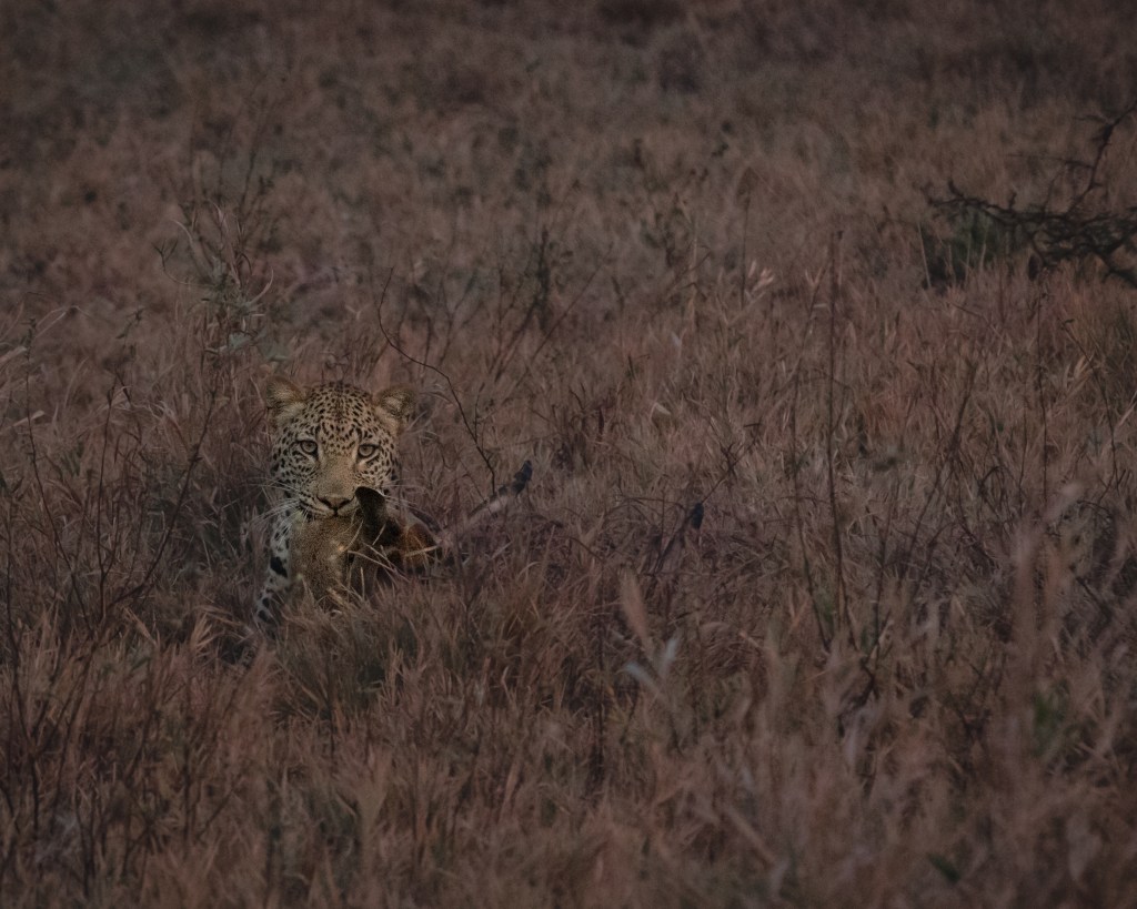 So far we this week we have driven up to the north section of Karingani twice and on the way had incredible drives – we saw elephants, a big herd of wildebeests, zebra, a stunning group of massive male kudus annnnnndddd yesterday morning on the way to photograph a management burn WE SAW A LEOPARD MAKE A KILL right in front of my cruiser!!!!!!!!! It was only the second kill I have ever seen in the bush and I was so excited about it! (Ryno slept through the whole thing). This young leopard (I am guessing male but was not able to confirm) took a male duiker right in front of me in the road and then moved off about 15 meters, but still in the open. He was pretty skittish though and after he killed the duiker he moved off into a thick bush. I knew he would come back out to eat his kill, so I stuck around and every so often I could see the leopard poking his head out to check on me, but he never wanted to come back so I decided to leave him in peace to enjoy his breakfast.