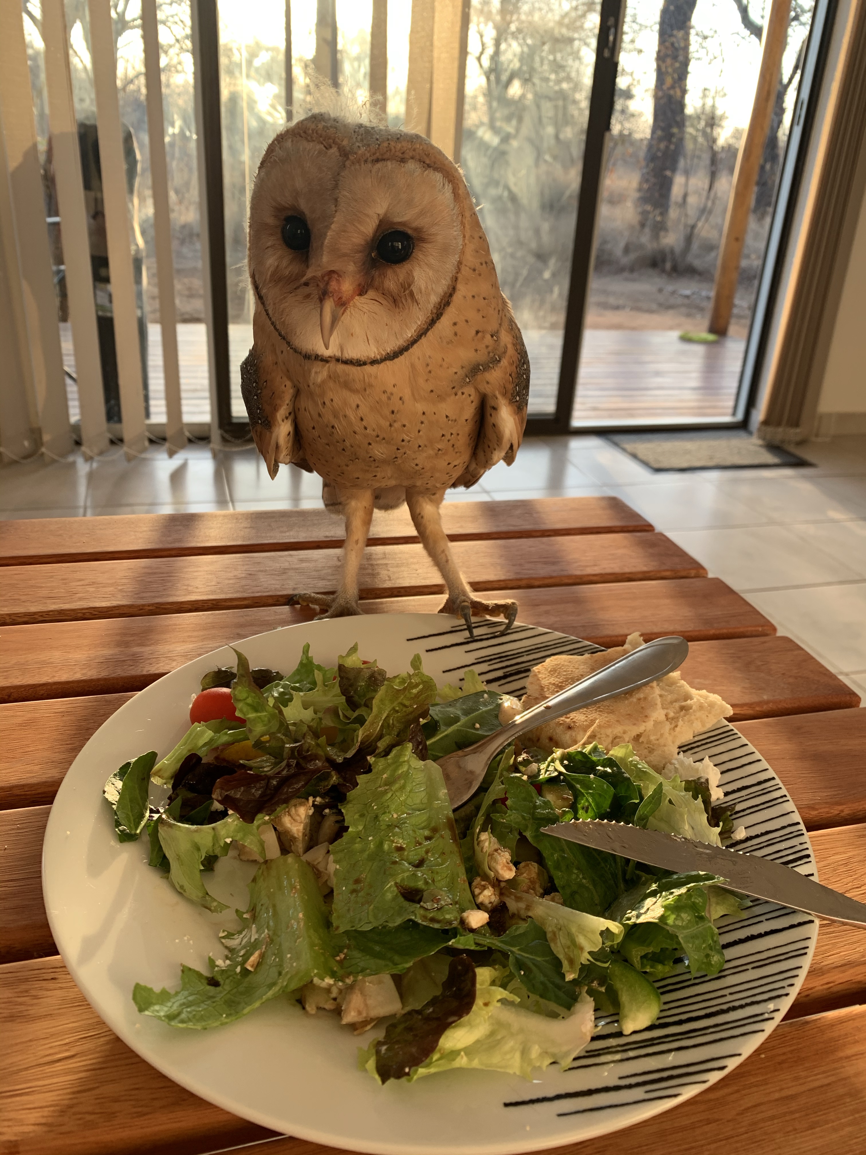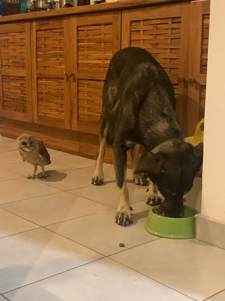 At first him and Hedwig were both scared of each other, but now they have set into a hierarchy with Hedwig as definitely the more dominant one. When Ryno is eating and she decides that she too is hungry, she will fly down and start biting at his toes until he moves away and then she tries and steals his food. You would think that I never fed her for how much begging she has been doing lately, she is worse than any dog. Last night she nearly landed in my salad and then tried to steal lettuce – someone please remind her that she is a raptor that eats MEAT not salad.