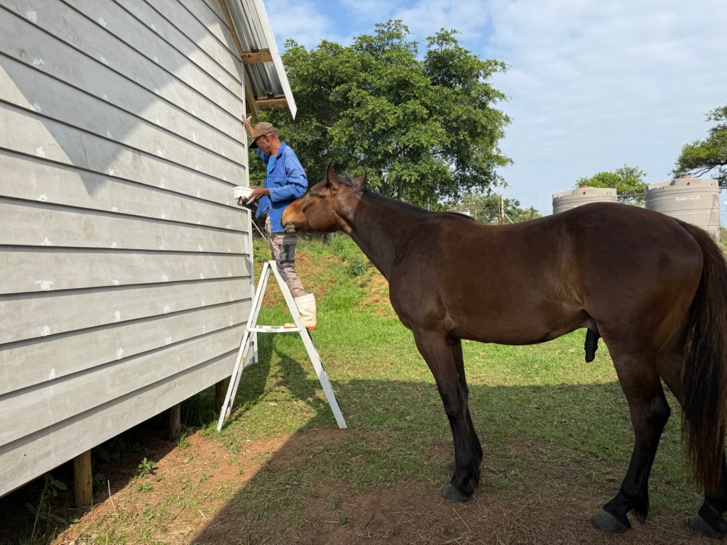 The horses were their usual mix of chaos and charm. Akira continues to grow into her legs, Moose thinks he is my personal assistant (whether I asked for help or not), and Bellatjie is doing great, especially with all the extra attention from Schotia. Moose was particular “helpful” and entertaining in his new role as construction supervisor leading to the horses being kicked out of the top field during most of the construction period. He loves to be where the action is, sticking his nose into quite literally everything! I absolutely adore him in every way.